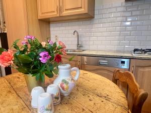 Plně vybavený kuchyňský kout obsahuje troubu, varnou desku, lednici, myčku nádobí i mikrovlnnou troubu a kávovar pro pohodlí při jídle. Další výhodou je soukromý vstup do horních pater pouze po schodech. Hosté mohou relaxovat na zahradě s venkovním nábytkem nebo navštívit kavárnu přímo v areálu.